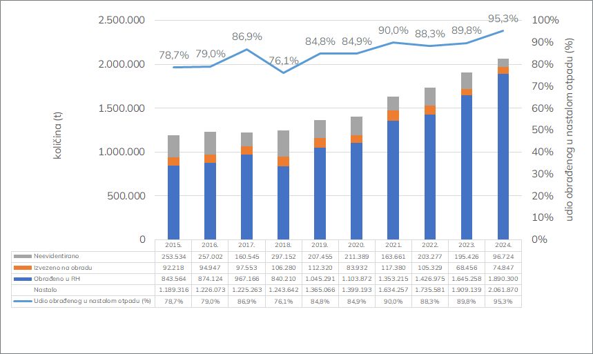 U razdoblju od 2015. do 2024. godine, procijenjena količina nastalog građevnog otpada povećana je za ukupno 73 %, a u odnosu na 2023. godinu za 8,0 %, te u 2024. godini iznosi 2.061.870 t. Istovremeno se kontinuirano povećavaju količine obrađenog otpada. Značajniji porast nastalog i obrađenog otpada bilježi se nakon 2018. godine, što je u skladu s kretanjem poslovnih i gospodarskih pokazatelja u sektoru građevinarstva, ali razlog je i napredak u osiguravanju infrastrukture za obradu građevnog otpada, porast oporabe, te poboljšanja u evidentiranju otpada.