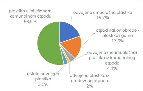 • U odvojeno sakupljenom otpadu od plastike najveći udio od 42,4 % čini otpad od plastične ambalaže te sekundarni otpad od obrade otpadne plastike i gume, 37,8 %. Najviše se otpada od plastike odvojeno sakupi iz kućanstava i uslužnog sektora. Otpad od plastike koji se odvojeno sakupi, uglavnom se oporabi.