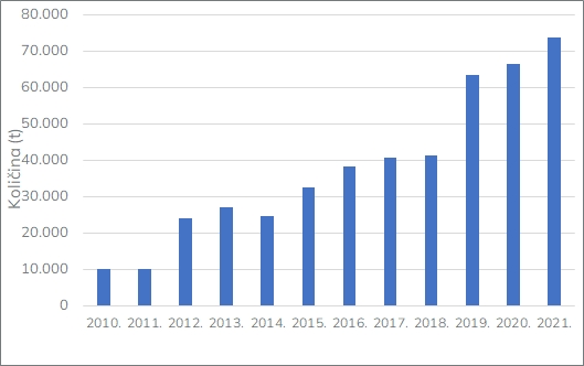 Slika: Količina odvojeno sakupljenog komunalnog otpada od plastike u razdoblju od 2010. do 2021. godine (t)