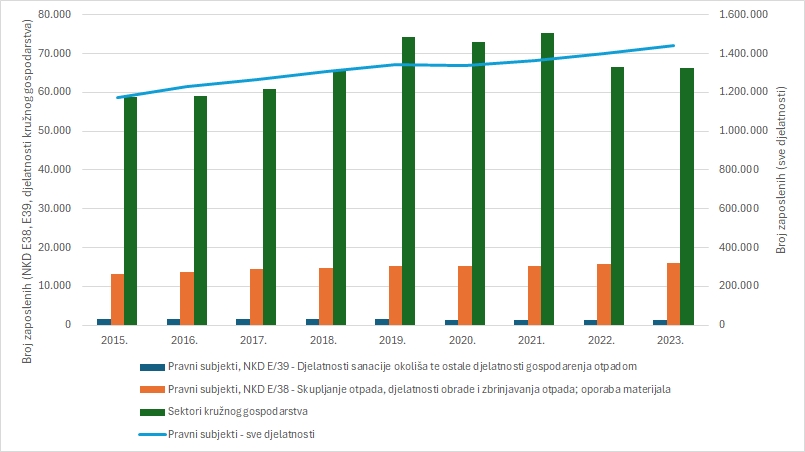 U razdoblju od 2015. do 2023. godine, ukupna zaposlenost, zaposlenost u djelatnostima kružnog gospodarstva i zaposlenost u djelatnostima gospodarenja otpadom pokazuju lagani porast.