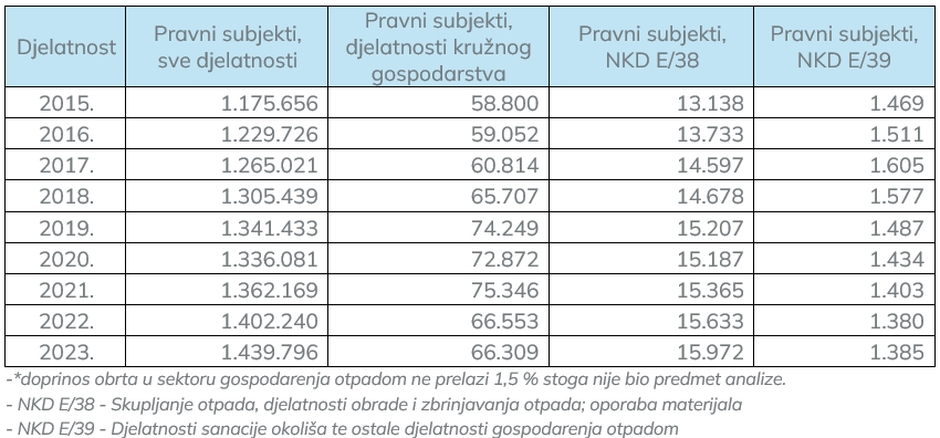 Udio zaposlenih u djelatnostima gospodarenja otpadom od 2015. do 2021. godine prosječno je iznosio 24 % u odnosu na djelatnosti kružnog gospodarstva, a od 2015. do 2023. godine iznosio je konstantnih 1,2 % u ukupnoj zaposlenosti.